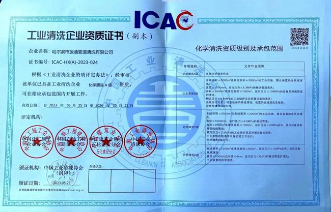 •   哈爾濱市振通管道清洗有限公司,是集管道清洗技術研究、清洗設備研發制造和管道清洗施工服務三位一體的科技型管道清洗技術服務公司。是國家清洗行業協會會員單位,具有協會頒發的物理清洗資質B級、化學清洗A級資質和安全生產作業證書。是黑龍江省高新技術企業,是全國科技創新先進單位。具有國家發明專利2項,實用新型專利8項。現有人員45人,其中科技人員17人。是民用供水管道清洗行業龍頭企業。公司成立二十多年來,應用先進的氣壓脈沖清洗和化學清洗等技術,為全國自來水公司、供暖公司做管道清洗技術服務共400多項,有效的為使用單位凈化供水水質、提高供暖溫度,均收到了非常理想的效果,受到了用戶廣泛好評...
